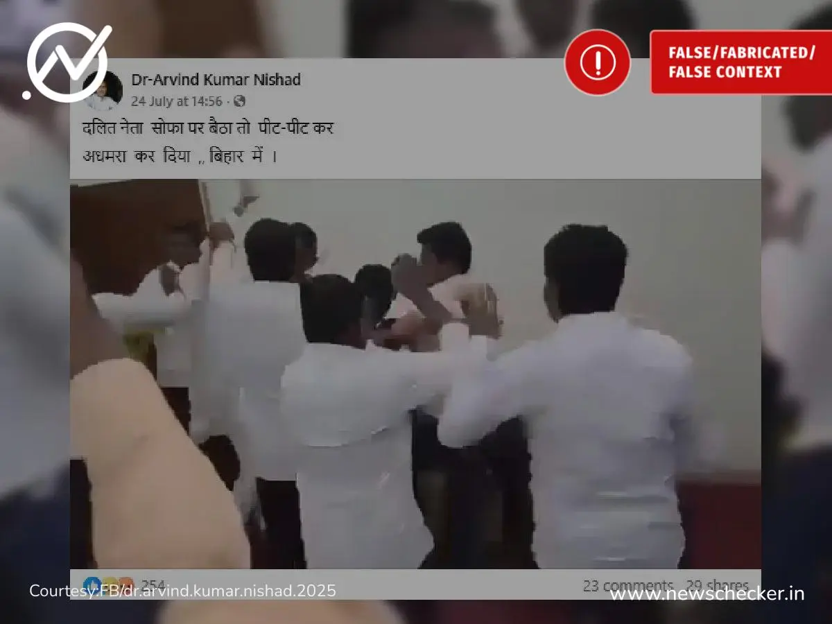 कई लोगों द्वारा एक व्यक्ति से मारपीट किए जाने का वीडियो सोशल मीडिया पर वायरल हो गया। दावा किया गया कि यह घटना बिहार की है जहां एक दलित नेता को सोफे पर बैठने की वजह से पीट दिया गया। हमारी जांच में यह दावा फर्जी साबित हुआ। फैक्ट चेक यहां पढ़ें।