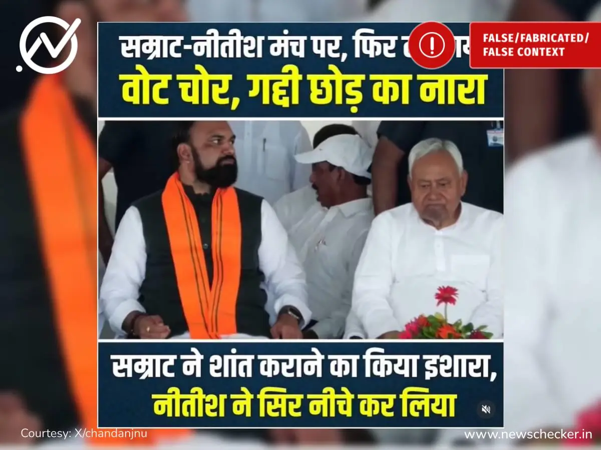 कई सोशल मीडिया यूजर्स ने एक वीडियो के जरिए दावा किया कि नीतीश कुमार और सम्राट चौधरी के सामने ‘वोट चोर, गद्दी छोड़’ के नारे लगाए गए। हमारी पड़ताल में यह दावा फर्जी साबित हुआ। रिपोर्ट यहां पढ़ें।
