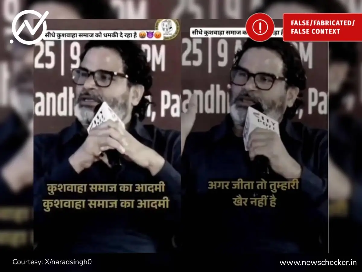 सोशल मीडिया पर जनसुराज पार्टी प्रमुख प्रशांत किशोर का एक वीडियो वायरल हो गया। दावा किया गया कि बिहार चुनाव से पहले उन्होंने कुशवाहा समाज को धमकी दी है। हमारी पड़ताल में यह दावा गलत साबित हुआ। रिपोर्ट यहां पढ़ें।