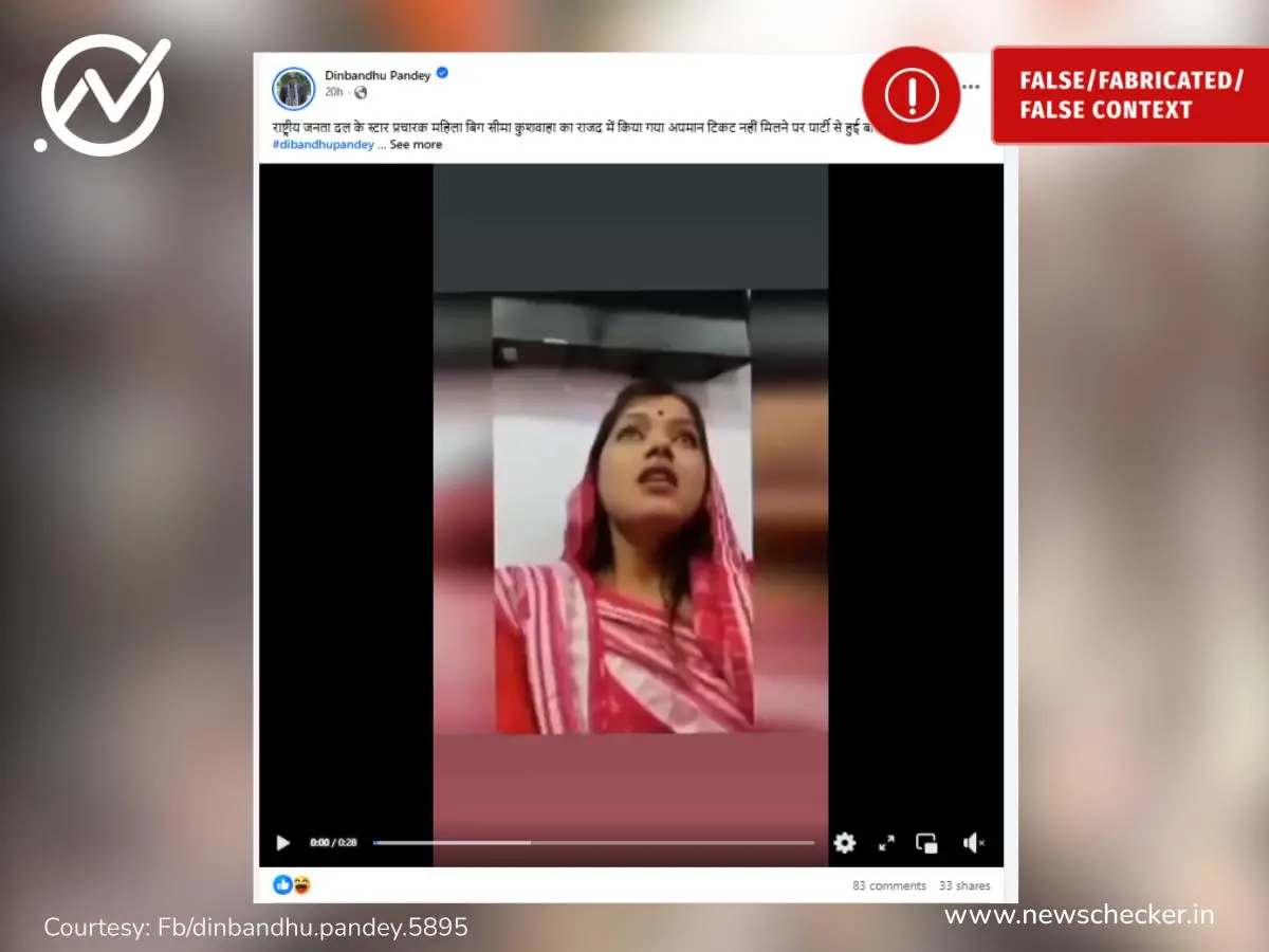 सोशल मीडिया पर राजद नेता सीमा कुशवाहा का एक वीडियो तेजी से वायरल हुआ। दावा किया गया कि राजद से टिकट नहीं मिलने पर वह रोने लगी। हमारी पड़ताल में यह दावा गलत साबित हुआ। फैक्ट चेक यहां पढ़ें।