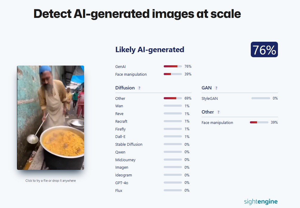 ಈ ಹಿನ್ನೆಲೆಯಲ್ಲಿ ನಾವು ವೀಡಿಯೋ-ಕೀಫ್ರೇಮ್ ಗಳನ್ನು ತೆಗೆದು ಎಐ ಪತ್ತೆ ವೇದಿಕೆಗಳ ಮೂಲಕ ಪರಿಶೀಲಿಸಿದ್ದೇವೆ. ಸೈಟ್ ಎಂಜಿನ್ ಮೂಲಕ ಪರಿಶೀಲಿಸಿದಾಗ, ಕೀಫ್ರೇಮ್ ಎಐ ಮೂಲಕ ಮಾಡಿದ ಚಿತ್ರಗಳಿವೆ ಎಂದು 76%ರಷ್ಟರ ಸಾಧ್ಯತೆಯನ್ನು ಹೇಳಿದೆ.