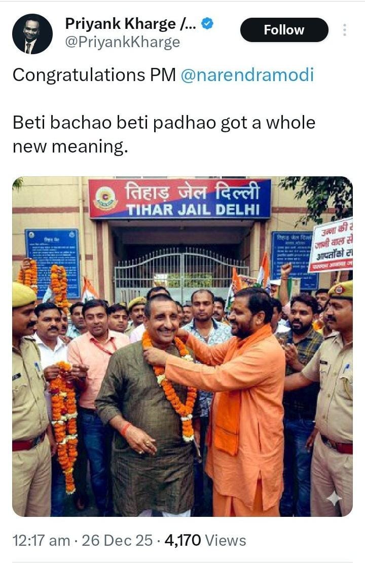 ಉನ್ನಾವೋ ಅತ್ಯಾಚಾರ ಪ್ರಕರಣದಲ್ಲಿ ವಿಚಾರಣಾ ನ್ಯಾಯಾಲಯವು ದೋಷಿ ಎಂದು ಘೋಷಿಸಿ ಜೀವಾವಧಿ ಶಿಕ್ಷೆ ವಿಧಿಸಿದ್ದ ಉಚ್ಚಾಟಿತ ಬಿಜೆಪಿ ನಾಯಕ ಕುಲದೀಪ್ ಸಿಂಗ್ ಸೆಂಗಾರ್ಗೆ ಡಿಸೆಂಬರ್ 23, 2 025 ರಂದು ವಿಧಿಸಲಾಗಿದ್ದ ಜೀವಾವಧಿ ಶಿಕ್ಷೆಯನ್ನು ದೆಹಲಿ ಹೈಕೋರ್ಟ್ ಅಮಾನತುಗೊಳಿಸಿದೆ. ಆ ಬೆನ್ನಲ್ಲೇ ಸಾಮಾಜಿಕ ಮಾಧ್ಯಮದಲ್ಲಿ ಫೊಟೋ ಒಂದು ವೈರಲ್ ಆಗಿದ್ದು, ನ್ಯಾಯಾಲಯದ ಆದೇಶದ ನಂತರ ಜೈಲಿನಿಂದ ಅತ್ಯಾಚಾರಿ ಸೆಂಗಾರ್ ಬಿಡುಗಡೆಯಾಗಿದ್ದು, ಅವರನ್ನು ಜನರು ಹಾರ ಹಾಕಿ ಸ್ವಾಗತಿಸುತ್ತಿದ್ದಾರೆ ಎಂದು ಹೇಳಲಾಗಿದೆ. ಕರ್ನಾಟಕದ ಐಟಿ ಸಚಿವ ಪ್ರಿಯಾಂಕ್ ಖರ್ಗೆ ಅವರೂ ಎಕ್ಸ್ ನಲ್ಲಿ ಈ ಫೋಟೋವನ್ನು ಹಂಚಿಕೊಂಡಿದ್ದು, ಬಳಿಕ ಡಿಲೀಟ್ ಮಾಡಿದ್ದಾರೆ.