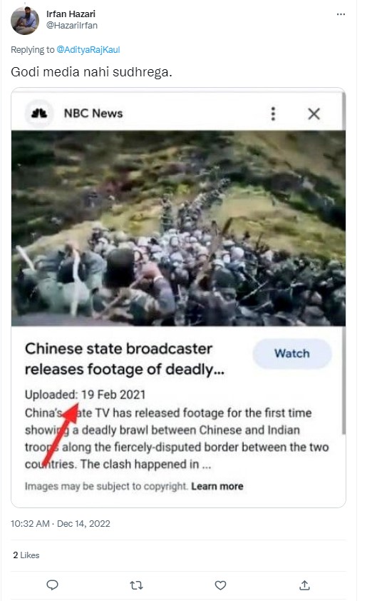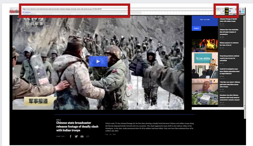 ಎನ್ಬಿಸಿ ತನ್ನ ವರದಿಯಲ್ಲಿ ಭಾರತ ಮತ್ತು ಚೀನಾ ನಡುವಿನ ಗಡಿ ಬಿಕ್ಕಟ್ಟಿನ ಕುರಿತು 1.35 ನಿಮಿಷಗಳ ವೀಡಿಯೋವನ್ನು ಪೋಸ್ಟ್ ಮಾಡಿದೆ. ಇದರಲ್ಲಿ “ಚೀನಾದ ಸರ್ಕಾರಿ ಸ್ವಾಮ್ಯದ ಟಿವಿಯು ಮೊದಲ ಬಾರಿಗೆ ಚೀನ ಮತ್ತು ಭಾರತೀಯ ಸೈನಿಕರ ನಡುವೆ ಗಡಿಯಲ್ಲಿ ನಡೆದ ಮಾರಣಾಂತಿಕ ಕಾದಾಟದ ವೀಡಿಯೋವನ್ನು ಬಿಡುಗಡೆ ಮಾಡಿದೆ. ಹಿಮಾಲಯದ ಗಾಲ್ವಾನ್ ಕಣಿವೆಯಲ್ಲಿ ಜೂನ್ 2020ರಂದು ಈ ಕಾದಾಟ ನಡೆದಿತ್ತು. ಆ ಹೊತ್ತಿಗೆ ಭಾರತದ 20 ಮಂದಿ ಸೈನಿಕರು ಸಾವನ್ನಪ್ಪಿದ್ದರೆ, ಚೀನ ತನ್ನ ನಾಲ್ವರು ಸೈನಿಕರು ಮಾತ್ರ ಮೃತಪಟ್ಟಿದ್ದಾಗಿ ಹೇಳಿತ್ತು”