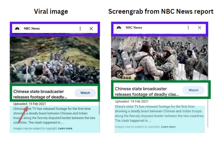 ಈ ಕುರಿತು “NBC News, Chinese broadcaster, deadly clash ಮತ್ತು February 19” ಎಂದು ಗೂಗಲ್ ಕೀವರ್ಡ್ ಸರ್ಚ್ ನಡೆಸಿದಾಗ, ಇದೇ ಹೆಡ್ಲೈನ್ ಅನ್ನು ನೀಡಲಾಗಿದೆ. ಆದರೆ ಈ ಸುದ್ದಿಯಲ್ಲಿನ ಥಂಬ್ನೈಲ್ ಫೋಟೋ ಮಾತ್ರ ಭಿನ್ನವಾಗಿದೆ. ವೈರಲ್ ಚಿತ್ರ ಮತ್ತು ಎನ್ಬಿಸಿ ಸುದ್ದಿವಾಹಿನಿಯ ಸ್ಕ್ರೀನ್ಗ್ರ್ಯಾಬ್ ನಡುವಿನ ವ್ಯತ್ಯಾಸವನ್ನು ಇಲ್ಲಿ ನೋಡಬಹುದು.