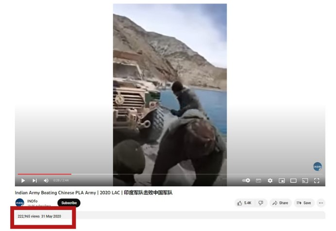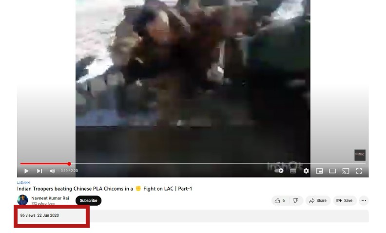 ಈ ವೀಡಿಯೋವನ್ನು Prince Kr.Upadhyay ಚಾನೆಲ್ನಲ್ಲಿ 2020 ಮೇ 31ರಂದು ಪ್ರಕಟವಾಗಿದೆ. ಇದರ ಶೀರ್ಷಿಕೆಯಲ್ಲಿ “ಭಾರತೀಯ ಸೈಬಿಕರು ಎಲ್ಎಸಿ 2020ಯಲ್ಲಿ ಚೀನ ಸೈನಿಕರಿಗೆ ಹೊಡೆಯುತ್ತಿರುವುದು” ಎಂದಿದೆ. ಇನ್ನೊಂದು ಯೂಟ್ಯೂಬ್ ಚಾನೆಲ್ J.D.Skylark Ladakh T.V ಕೂಡ ಅದೇ ದಿನ ವೀಡಿಯೋ ಶೇರ್ ಮಾಡಿದೆ.