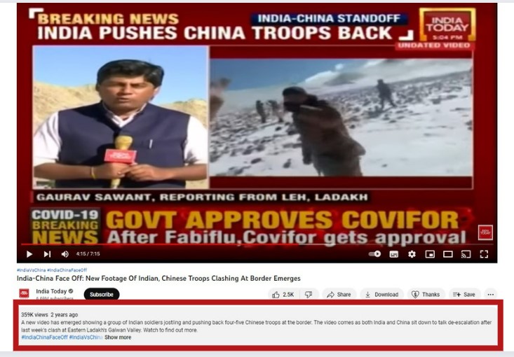 2020 ಜೂನ್ 22ರ ಇಂಡಿಯಾ ಟುಡೇಯ ಇನ್ನೊಂದು ವೀಡಿಯೋ ವೈರಲ್ ಕ್ಲಿಪ್ನ ತುಣುಕುಗಳನ್ನು ಹೊಂದಿದೆ. ಇದರ ವಿವರಣೆಯಲ್ಲಿ “ಈ ಹೊಸ ವೀಡಿಯೋದಲ್ಲಿ ಭಾರತೀಯ ಸೈನಿಕರು ನಾಲ್ಕೈದು ಚೀನ ಸೈನಿಕರನ್ನು ಹಿಂದಕ್ಕೆ ತಳ್ಳುತ್ತಿದ್ದಾರೆ. ಪೂರ್ವ ಲಡಾಖ್ನ ಗಲ್ವಾನ್ ಕಣಿವೆಯ ಜಟಾಪಟಿ ನಂತರ ಎರಡೂ ದೇಶಗಳು ಮಾತುಕತೆಗೆ ಕೂತ ಬೆನ್ನಲ್ಲೇ ಈ ವೀಡಿಯೋ ಸುದ್ದಿಮಾಡಿದೆ” ಎಂದು ಬರೆಯಲಾಗಿದೆ.