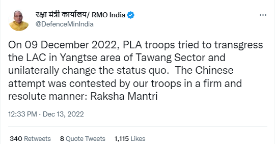 ಸಂಸತ್ತಿನಲ್ಲಿ ಭಾಷಣ ಮಾಡುವವೇಳೆ, ರಾಜನಾಥ್ ಸಿಂಗ್ ಅವರು ಮಾತನಾಡಿ, “ಡಿಸೆಂಬರ್ 9ರಂದು ತವಾಂಗ್ನ ಯಾಂಗ್ಟ್ಸೆ ಪ್ರದೇಶದಲ್ಲಿ ಪಿಎಲ್ಎ ಸೈನಿಕರು ಯಥಾಸ್ಥಿತಿಯನ್ನು ಉಲ್ಲಂಘಿಸಲು ಯತ್ನಿಸಿದ್ದರು. ಇದನ್ನು ನಮ್ಮ ಸೈನಿಕರು ಸೂಕ್ತ ಕ್ರಮದ ಮೂಲಕ ನಿರ್ವಹಣೆ ಮಾಡಿದ್ದಾರೆ. ನಮ್ಮ ಸೈನಿಕರು ವೀರೋಚಿತವಾಗಿ ಪಿಎಲ್ಎ ಸೈನಿಕರು ನಮ್ಮ ಗಡಿಯನ್ನು ಕಬಳಿಸುವುದನ್ನು ತಡೆದಿದ್ದು ಅವರನ್ನು ಅವರ ಪ್ರದೇಶಕ್ಕೆ ಬಲವಂತವಾಗಿ ಹೋಗುವಂತೆ ಮಾಡುವಲ್ಲಿ ಸಫಲವಾಗಿದ್ದಾರೆ” ಎಂದು ಹೇಳಿದ್ದಾರೆ. ಇದರೊಂದಿಗೆ “ಈ ಕಾಳಗದಲ್ಲಿ ಎರಡೂ ಕಡೆಯ ಸೈನಿಕರಿಗೆ ಗಾಯಗಳಾಗಿವೆ. ಈ ಸದನಕ್ಕೆ ನಾನು ಖಚಿತಪಡಿಸುವುದೇನೆಂದರೆ, ಯಾವುದೇ ಭಾರತದ ಸೈನಿಕ ಹತನಾಗಿಲ್ಲ ಮತ್ತು ತೀವ್ರವಾಗಿ ಗಾಯಗೊಂಡಿಲ್ಲ” ಎಂದು ಹೇಳಿದ್ದಾರೆ. ರಾಜನಾಥ್ ಸಿಂಗ್ ಅವರ ಈ ಹೇಳಿಕೆಯ ಪೂರ್ಣ ವಿವರ ಇಲ್ಲಿದೆ.