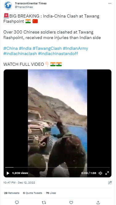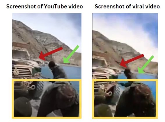 ಅಂತಹ ವೀಡಿಯೋಗಳಲ್ಲಿ ಒಂದನೆಯದು ಸೈನಿಕರ ಗುಂಪು ದೈಹಿಕವಾಗಿ ಕಾದಾಟಕ್ಕೆ ಇಳಿದಿರುವುದು ಮತ್ತು ಇನ್ನೊಂದರಲ್ಲಿ ಸೇನಾ ವಾಹನವೊಂದನ್ನು ಪುಡಿಗಟ್ಟುತ್ತಿರುವ ವೀಡಿಯೋ ಇದೆ. ಈ ಎರಡೂ ವೀಡಿಯೋಗಳು ಹಳೆಯ ವೀಡಿಯೋಗಳಾಗಿದ್ದು ಮೊನ್ನೆ ವರದಿಯಾದ ತವಾಂಗ್ನದ್ದಲ್ಲ ಎನ್ನುವುದನ್ನು ನ್ಯೂಸ್ಚೆಕರ್ ಕಂಡುಕೊಂಡಿದೆ.