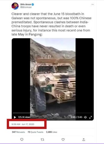 ಪತ್ರಕರ್ತ ಶಿವ್ ಆರೂರು ಕೂಡ ವೈರಲ್ ವೀಡಿಯೋದ ದೀರ್ಘ ಆವೃತ್ತಿಯನ್ನು 2020 ಜೂನ್ 17ರಂದು ಟ್ವೀಟ್ ಮೂಲಕ ಶೇರ್ ಮಾಡಿದ್ದಾರೆ. ಇದರ ಕ್ಯಾಪ್ಷನ್ನಲ್ಲಿ “ಗಾಲ್ವಾನ್ನಲ್ಲಿ ಜೂನ್ 15ರಂದು ನಡೆದ ರಕ್ತದೋಕುಳಿ ಆಕಸ್ಮಿಕವಲ್ಲ, ಅದು ಶೇ.100ರಷ್ಟು ಪೂರ್ವ ನಿಯೋಜಿತ. ಭಾರತ-ಚೀನಾ ಪಡೆಗಳ ನಡುವಿನ ಸ್ವಯಂಪ್ರೇರಿತ ಘರ್ಷಣೆಗಳು ಎಂದಿಗೂ ಸಾವು ಅಥವಾ ಗಂಭೀರ ಗಾಯಕ್ಕೆ ಕಾರಣವಾಗಿಲ್ಲ. ಉದಾಹರಣೆಗೆ ಪ್ಯಾಗಾಂಗ್ನಲ್ಲಿ ಇತ್ತೀಚೆಗೆ ಮೇ ಅಂತ್ಯದಲ್ಲಿ ನಡೆದ ಘರ್ಷಣೆ ಇತ್ತೀಚಿನದು” ಎಂದಿದೆ.