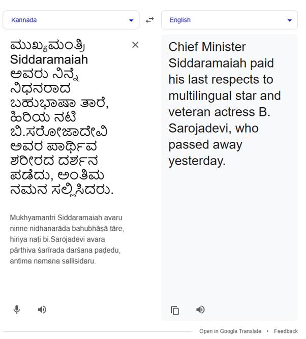 ಆ ಬಳಿಕ ನಾವು ಪೋಸ್ಟ್ ಅನ್ನು ಫೇಸ್ಬುಕ್ ನಲ್ಲಿ ಇಂಗ್ಲಿಷ್ ಗೆ ಟ್ರಾನ್ಸ್ ಲೇಷನ್ ಮಾಡಿ ನೋಡಿದ್ದೇವೆ. ಈ ವೇಳೆ ವೈರಲ್ ಪೋಸ್ಟ್ ಗಳಲ್ಲಿರುವಂತೆ ಅನುವಾದ ತಪ್ಪಾಗಿರುವುದನ್ನು ಗಮನಿಸಿದ್ದೇವೆ. ಈ ಅನುವಾದದ ಪ್ರಕಾರ “Chief minister Siddaramaiah passed away yesterday multilingual star, senior actress B Took darshan of Sarojadevi’s earthly body and paid his last respects” ಎಂದಿದೆ. ಕನ್ನಡದ ಮೂಲಕ ವಾಕ್ಯವನ್ನು ಗಮನಿಸಿದಾಗ ಇದರಲ್ಲಿ ವಾಕ್ಯದ ಅನುವಾದದಲ್ಲಿ ತಪ್ಪು, ವಾಕ್ಯದ ರಚನೆಯಲ್ಲಿ ವ್ಯತ್ಯಾಸ ಇರುವುದು ಖಾತ್ರಿಯಾಗುತ್ತದೆ.