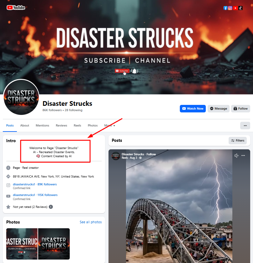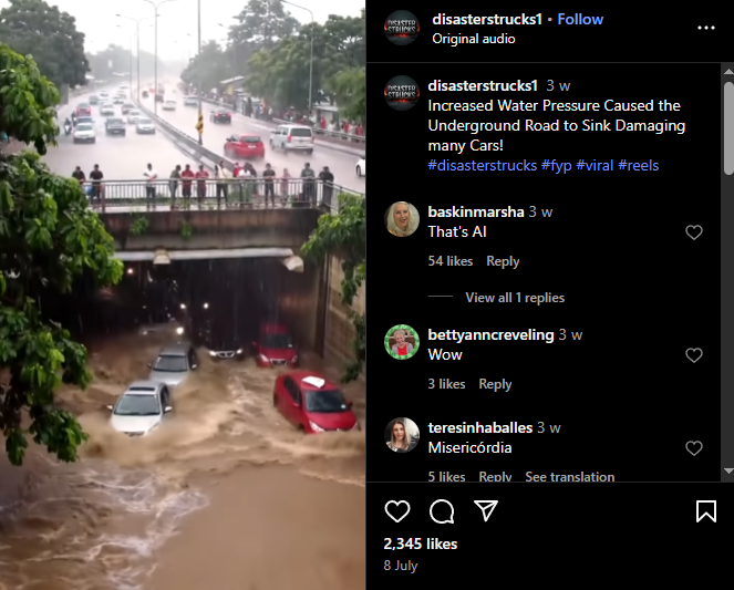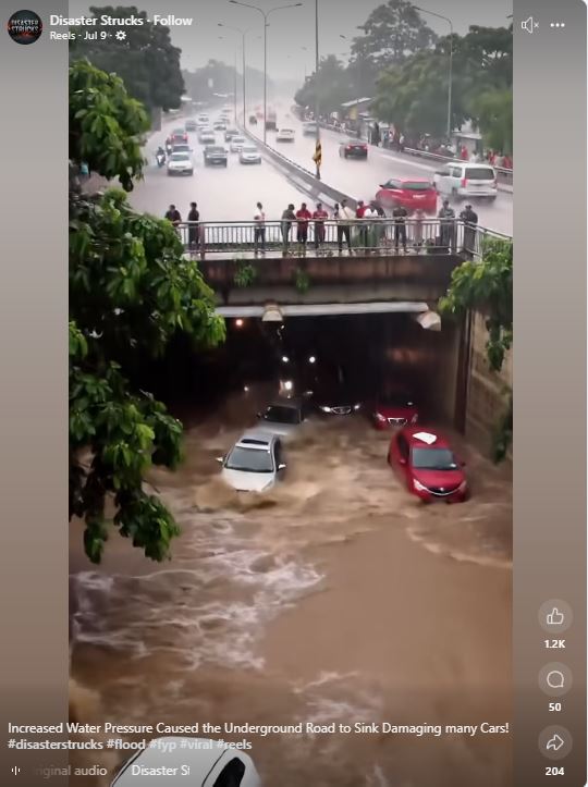 ಆ ನಂತರದಲ್ಲಿ ನಾವು ವೈರಲ್ ವೀಡಿಯೋದ ಕೀಫ್ರೇಮ್ ಗಳನ್ನು ಗೂಗಲ್ ಲೆನ್ಸ್ ಮೂಲಕ ಪರಿಶೀಲಿಸಿದ್ದೇವೆ. ಈ ವೇಳೆ Disaster Strucks ಎಂಬ ಫೇಸ್ಬುಕ್ ಪೇಜ್ ಲಭ್ಯವಾಗಿದೆ. ಬಳಕೆದಾರರು ಇದರಲ್ಲಿ ವೈರಲ್ ವೀಡಿಯೋವನ್ನು ಹೋಲುವ ವೀಡಿಯೋವನ್ನು ಜುಲೈ 9ರಂದು ಪೋಸ್ಟ್ ಮಾಡಿದ್ದಾರೆ. ಇದರ ವಿವರಣೆಯಲ್ಲಿ “ನೀರಿನ ಒತ್ತಡ ಹೆಚ್ಚಿದ್ದರಿಂದ ಭೂಗತ ರಸ್ತೆ ಮುಳುಗಿ ಹಲವು ಕಾರುಗಳು ಹಾನಿಗೊಳಗಾದವು.” ಎಂದು ಬರೆದಿದ್ದಾರೆ. ಈ ಪೇಜ್ ಬಗ್ಗೆ ನಾವು ಇನ್ನಷ್ಟು ಶೋಧ ನಡೆಸಿದಾಗ, ಪೇಜ್ ಪೀಠಿಕೆಯಲ್ಲಿ, “”ವಿಪತ್ತು ಆಘಾತಗಳು” ಪುಟಕ್ಕೆ ಸುಸ್ವಾಗತ AI – ಮರುಸೃಷ್ಟಿಸಿದ ವಿಪತ್ತು ಘಟನೆಗಳು. AI ನಿಂದ ರಚಿಸಲಾದ ವಿಷಯ” ಎಂದು ಬರೆದಿರುವುದನ್ನು ಗಮನಿಸಿದ್ದೇವೆ.
