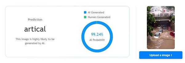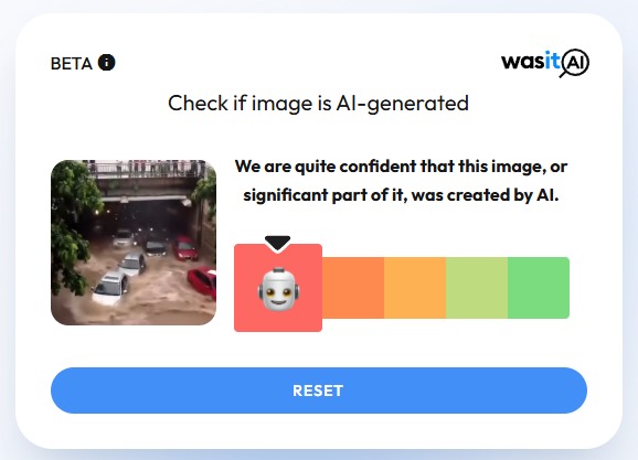 ವಾಸ್ ಇಟ್ ಎಐ ಮೂಲಕ ಪರಿಶೀಲಿಸಿದಾಗ, ಈ ಚಿತ್ರ ಅಥವಾ ಈ ಚಿತ್ರದ ಭಾಗವನ್ನು ಎಐ ನಿಂದ ಮಾಡಲ್ಪಟ್ಟಿದೆ ಎಂದು ಹೇಳಿದೆ.