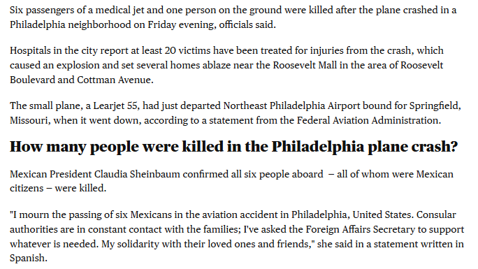 ಫೆಬ್ರವರಿ 4, 2025ರ ಸಿಬಿಸಿನ್ಯೂಸ್ ವರದಿಯ ಪ್ರಕಾರ, ಶುಕ್ರವಾರ ಸಂಜೆ ಫಿಲಡೆಲ್ಫಿಯಾ ಭಾಗದಲ್ಲಿ ವೈದ್ಯಕೀಯ ಜೆಟ್ ವಿಮಾನ ಅಪಘಾತಕ್ಕೀಡಾಗಿ ಆರು ಪ್ರಯಾಣಿಕರು ಮತ್ತು ದಾರಿಹೋಕ ವ್ಯಕ್ತಿ ಸಾವನ್ನಪ್ಪಿದ್ದಾರೆ ಎಂದು ಅಧಿಕಾರಿಗಳು ತಿಳಿಸಿದ್ದಾರೆ. ರೂಸ್ವೆಲ್ಟ್ ಬೌಲೆವಾರ್ಡ್ ಮತ್ತು ಕಾಟ್ಮನ್ ಅವೆನ್ಯೂ ಪ್ರದೇಶದ ರೂಸ್ವೆಲ್ಟ್ ಮಾಲ್ ಬಳಿ ಅಪಘಾತ ಸಂಭವಿಸಿ ಹಲವಾರು ಮನೆಗಳಿಗೆ ಬೆಂಕಿ ಬಿದ್ದಿದೆ. ಇದರಿಂದ ಕನಿಷ್ಠ 20 ಮಂದಿ ಗಾಯಗೊಂಡು ಚಿಕಿತ್ಸೆ ಪಡೆಯುತ್ತಿದ್ದಾರೆ ಎಂದು ನಗರದ ಆಸ್ಪತ್ರೆಗಳು ವರದಿ ಮಾಡಿವೆ. ಫೆಡರಲ್ ಏವಿಯೇಷನ್ ಅಡ್ಮಿನಿಸ್ಟ್ರೇಷನ್ನ ಹೇಳಿಕೆಯ ಪ್ರಕಾರ, ಲಿಯರ್ಜೆಟ್ 55 ಎಂಬ ಸಣ್ಣ ವಿಮಾನವು ಈಶಾನ್ಯ ಫಿಲಡೆಲ್ಫಿಯಾ ವಿಮಾನ ನಿಲ್ದಾಣದಿಂದ ಮಿಸೌರಿಯ ಸ್ಪ್ರಿಂಗ್ಫೀಲ್ಡ್ಗೆ ಹೊರಟಿದ್ದಾಗ ಪತನಗೊಂಡಿತು ಎಂದಿದೆ.