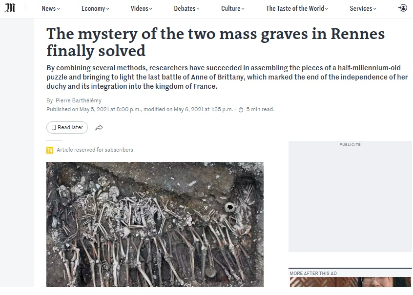 ಫ್ರೆಂಚ್ ಲೇಖನಗಳ ಪ್ರಕಾರ, 2011 ರಿಂದ 2013 ರವರೆಗೆ, INRAP ನ ತಂಡವು ಐದು ಶತಮಾನಗಳಿಗೂ ಹಿಂದೆ ಫ್ರಾನ್ಸ್ನ ಪ್ರದೇಶವಾದ ಬ್ರಿಟಾನಿಯ ಭವಿಷ್ಯವನ್ನು ನಿರ್ಧರಿಸಿದ್ದ ಅದೇ ಜಾಕೋಬಿನ್ ಕಾನ್ವೆಂಟ್ನಲ್ಲಿ ನೂರಾರು ಶವಗಳನ್ನು ಪತ್ತೆಹಚ್ಚಿತು. ಈ ವರದಿಗಳು ನಮ್ಮನ್ನು ಮೇ 5, 2021 ರಂದು PLOS One ನಲ್ಲಿ ನಡೆಸಿದ ಈ ಅಧ್ಯಯನಕ್ಕೆ ಕರೆದೊಯ್ದವು , ಇದು ಪೀರ್-ರಿವ್ಯೂಡ್ ಓಪನ್ ಆಕ್ಸೆಸ್ ಮೆಗಾ ಜರ್ನಲ್ ಆಗಿದೆ. ಈ ಅಸ್ಥಿಪಂಜರಗಳು ಬ್ರೆಟನ್ ಇತಿಹಾಸದ ಪ್ರಮುಖ ಘಟನೆಯಾದ 1491 ರಲ್ಲಿ ರೆನ್ನೆಸ್ ಮುತ್ತಿಗೆಯ ಸಮಯದಲ್ಲಿ ಹೋರಾಡಿದ ಎರಡು ಶತ್ರು ಸೈನ್ಯಗಳ ಸೈನಿಕರಿಗೆ ಸೇರಿವೆ ಎಂದು ಹೇಳಿದೆ. ಇದು ಫ್ರಾನ್ಸ್ ರಾಜನೊಂದಿಗೆ ಬ್ರಿಟಾನಿಯ ಡಚೆಸ್ ಅವರ ವಿವಾಹದೊಂದಿಗೆ ಕೊನೆಗೊಂಡಿತು ಮತ್ತು ಈ ಪ್ರದೇಶದ ಸ್ವಾತಂತ್ರ ಕೊನೆಯಾಯಿತು.
