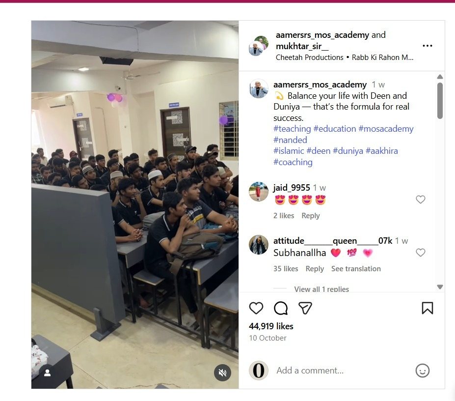 ವೀಡಿಯೋದ ಕೀಫ್ರೇಮ್ಗಳ ರಿವರ್ಸ್ ಇಮೇಜ್ ಸರ್ಚ್ ಮಾಡಿದಾಗ ಅಕ್ಟೋಬರ್ 10, 2025 ರಂದು @aamersrs_mos_academy ಖಾತೆಯಿಂದ ಪೋಸ್ಟ್ ಮಾಡಲಾದ ಇನ್ಸ್ಟಾಗ್ರಾಂ ರೀಲ್ ಲಭ್ಯವಾಗಿದೆ. ಈ ರೀಲ್ನ ಶೀರ್ಷಿಕೆ ಹೀಗಿದೆ: “ದೀನ್ ಮತ್ತು ದುನಿಯಾ ಅವರೊಂದಿಗೆ ನಿಮ್ಮ ಜೀವನವನ್ನು ಸಮತೋಲನಗೊಳಿಸಿ – ಅದುವೇ ಯಶಸ್ಸಿಗೆ ನಿಜವಾದ ಸೂತ್ರ” ಎಂದಿದೆ.