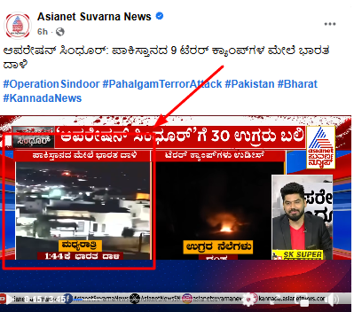 ಏಷ್ಯಾನೆಟ್ ಸುವರ್ಣ ನ್ಯೂಸ್ ಕೂಡ ಇದೇ ವೀಡಿಯೋವನ್ನು ಹಂಚಿಕೊಂಡಿದ್ದು ಆಪರೇಷನ್ ಸಿಂದೂರದ ದೃಶ್ಯಾವಳಿ ಎಂದು ಹೇಳಿಕೊಂಡಿದೆ.