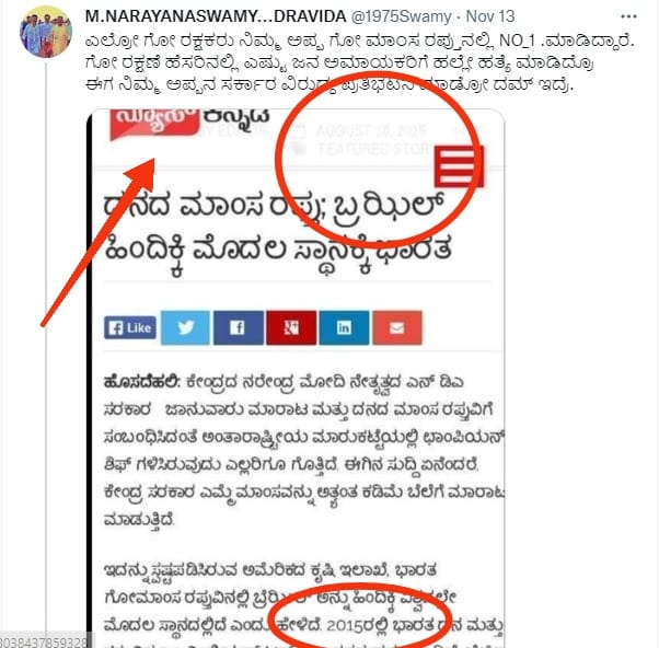 ಇದರೊಂದಿಗೆ ನ್ಯೂಸ್ ಚೆಕರ್ ಟ್ವೀಟರ್ ಪೋಸ್ಟ್ನಲ್ಲಿ ಹಾಕಲಾದ ಸ್ಕ್ರೀನ್ಶಾಟ್ ಅನ್ನು ಕೂಲಂಕಷವಾಗಿ ಪರಿಶೀಲಿಸಲಾಗಿದ್ದು ಇದು ನ್ಯೂಸ್ ಕನ್ನಡ ಆಪ್ ನಿಂದ ತೆಗೆದಿದ್ದಾಗಿದೆ. ಇದರಲ್ಲಿ ಸುದ್ದಿಯ ಕುರಿತು ಸರ್ಚ್ ಮಾಡಿದಾಗ ಅಂತಹ ಯಾವುದೇ ಸುದ್ದಿಯ ಫಲಿತಾಂಶ ಬಂದಿರುವುದಿಲ್ಲ. ಜೊತೆಗೆ ಈ ಸ್ಕ್ರೀನ್ ಶಾಟ್ ಪ್ರಕಾರ ಭಾರತ 2015ರಲ್ಲಿ ಅತ್ಯಧಿಕ ಗೋಮಾಂಸ ರಫ್ತು ಮಾಡಿದೆ ಎಂದು ಹೇಳಲಾಗಿದೆ. ಸುದ್ದಿಯ ದಿನಾಂಕವೂ 2015 ಆಗಸ್ಟ್ 16 ಆಗಿದೆ.