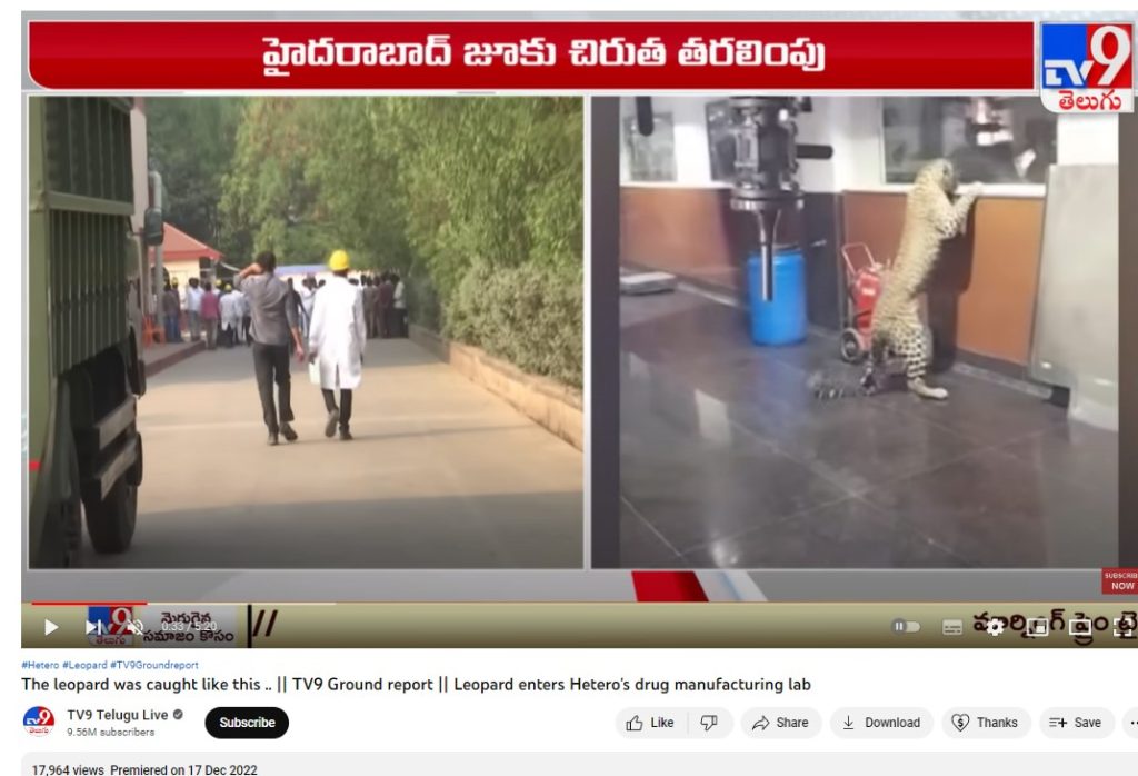 ಈ ವರದಿಯನ್ನು ಮೂಲವಾಗಿ ಪರಿಗಣಿಸಿ, ನಾವು “Hetero pharma facility”, “Telangana”, & “leopard” ಎಂದು ಯೂಟ್ಯೂಬ್ನಲ್ಲಿ ಸರ್ಚ್ ನಡೆಸಿದ್ದು, ಟಿವಿ 9 ತೆಲುಗು ಲೈವ್ನಲ್ಲಿ ಈ ವೀಡಿಯೋ ಡಿಸೆಂಬರ್ 17, 2022 ರಂದು ಅಪ್ಲೋಡ್ ಆಗಿರುವುದು ಪತ್ತೆಯಾಗಿದೆ. ಜೊತೆಗೆ “ಹೆಟೆರೋ ಔಷಧ ಉತ್ಪಾದನಾ ಲ್ಯಾಬ್ ಒಳಗೆ ಪ್ರವೇಶಿಸಿದ ಚಿರತೆ ಎಂದಿದೆ.