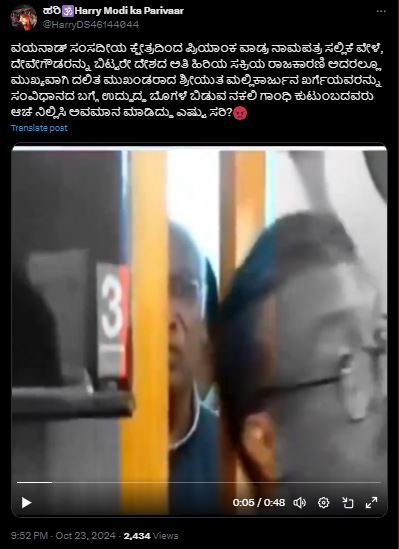 ಪ್ರಿಯಾಂಕಾ ಗಾಂಧಿ ನಾಮಪತ್ರ ಸಲ್ಲಿಕೆ ವೇಳೆ ಕಾಂಗ್ರೆಸ್ ಅಧ್ಯಕ್ಷ ಮಲ್ಲಿಕಾರ್ಜುನ ಖರ್ಗೆ ಅವರು ಕೊಠಡಿ ಹೊರಗೆ ಕಾಯುತ್ತಿರುವ ದೃಶ್ಯವಿರುವ ವೀಡಿಯೋ ಒಂದು ಸಾಮಾಜಿಕ ಮಾಧ್ಯಮಗಳಲ್ಲಿ ವೈರಲ್ ಆಗಿದೆ.