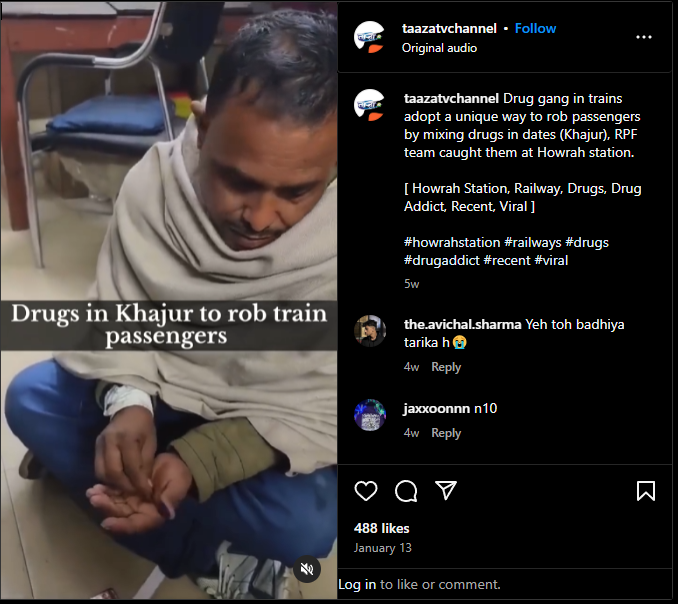 ಹೆಚ್ಚಿನ ಶೋಧನೆ ವೇಳೆ taazatvchannel ಹೆಸರಿನ ಇನ್ನೊಂದು ಇನ್ಸ್ಟಾಗ್ರಾಂ ಬಳಕೆದಾರರು ಅದೇ ವೀಡಿಯೋವನ್ನು ಪೋಸ್ಟ್ ಮಾಡಿದ್ದನ್ನು ಪತ್ತೆ ಮಾಡಿದ್ದೇವೆ. ಜನವರಿ 13, 2025ರ ಈ ಪೋಸ್ಟ್ ನಲ್ಲಿ ಖರ್ಜೂರದಲ್ಲಿ ಮತ್ತು ಬರಿಸುವ ಮಾತ್ರೆ ನೀಡಿ ರೈಲಿನಲ್ಲಿ ದರೋಡೆ ಮಾಡುತ್ತಿದ್ದ ಗ್ಯಾಂಗ್ ಅನ್ನು ರೈಲ್ವೇ ಪೊಲೀಸರು ಬಂಧಿಸಿದ್ದಾಗಿ ಹೇಳಲಾಗಿದೆ.