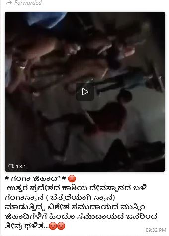 ವಾಟ್ಸಾಪಿನಲ್ಲಿ ಹಂಚಿಕೊಳ್ಳಲಾಗುತ್ತಿರುವ ಹೇಳಿಕೆಯಲ್ಲಿ, “ಗಂಗಾ ಜಿಹಾದ್ – ಉತ್ತರ ಪ್ರದೇಶದ ಕಾಶಿಯ ದೇವಸ್ಥಾನದ ಬಳಿ ಹಿಂದೂ ಹೆಂಗಸರು ಸ್ನಾನ ಮಾಡುವ ಸ್ಥಳದಲ್ಲಿ ಬೆತ್ತಲೆ ಸ್ನಾನ ಮುಸ್ಲಿಂ ಜಿಹಾದಿ ಗಂಡಸರಿಗೆ ಹಿಂದೂ ಸಮುದಾಯದ ಜನರಿಂದ ತೀವ್ರ ಥಳಿತ” ಎಂದಿದೆ.