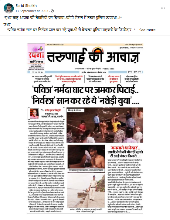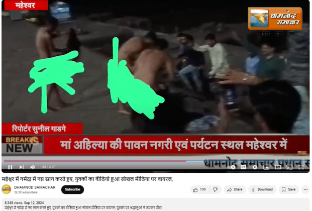 ಫೇಸ್ಬುಕ್ ಪೋಸ್ಟ್ನಲ್ಲಿ ತರುನೈ ಕಿ ಆವಾಜ್ ಎಂಬ ಪತ್ರಿಕೆಯ ಕಟಿಂಗ್ ಇತ್ತು, ಅದರಲ್ಲಿ ವೈರಲ್ ವೀಡಿಯೋದ ದೃಶ್ಯಗಳಿವೆ. ಸೆಪ್ಟೆಂಬರ್ 10, 2024 ರ ಮಂಗಳವಾರ, ಕೆಲವು ವ್ಯಸನಿ ಯುವಕರು ಮಧ್ಯಪ್ರದೇಶದ ಖಾರ್ಗೋನ್ನ ನರ್ಮದಾ ನದಿಯ ಅಹಲ್ಯಾ ಘಾಟ್ನಲ್ಲಿ ನಗ್ನವಾಗಿ ಸ್ನಾನ ಮಾಡುತ್ತಿದ್ದರು ಎಂದು ಅದರ ಶೀರ್ಷಿಕೆಯಲ್ಲಿ ತಿಳಿಸಲಾಗಿದೆ. ಈ ಕಾರಣದಿಂದಾಗಿ ಸ್ಥಳೀಯ ಜನರು ಆ ಯುವಕರನ್ನು ಥಳಿಸಿದರು.