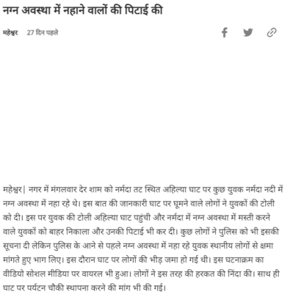 ಇದಲ್ಲದೆ, ದೈನಿಕ್ ಭಾಸ್ಕರ್ ವೆಬ್ಸೈಟ್ನಲ್ಲಿ ಇದಕ್ಕೆ ಸಂಬಂಧಿಸಿದ ವರದಿಗಳನ್ನು ಸಹ ನಾವು ಕಂಡುಕೊಂಡಿದ್ದೇವೆ. ಸೆಪ್ಟೆಂಬರ್ 10 ರ ಸಂಜೆ ಅಹಲ್ಯಾ ಘಾಟ್ನಲ್ಲಿ ಕೆಲವು ಯುವಕರು ನರ್ಮದಾ ನದಿಯಲ್ಲಿ ನಗ್ನ ಸ್ಥಿತಿಯಲ್ಲಿ ಸ್ನಾನ ಮಾಡುತ್ತಿದ್ದರು ಎಂದು ಈ ವರದಿಯಲ್ಲಿ ತಿಳಿಸಲಾಗಿದೆ. ಈ ವಿಷಯ ತಿಳಿದ ಸ್ಥಳೀಯ ಯುವಕರು ನದಿಯಲ್ಲಿ ಸ್ನಾನ ಮಾಡುತ್ತಿದ್ದ ಯುವಕರನ್ನು ಹೊರಗೆಳೆದು ಥಳಿಸಿದ್ದಾರೆ. ಆದಾಗ್ಯೂ, ಈ ಮಾಹಿತಿಯನ್ನು ಪೊಲೀಸರಿಗೂ ನೀಡಲಾಯಿತು, ಆದರೆ ಪೊಲೀಸರು ಬರುವ ಮೊದಲು, ಸ್ನಾನ ಮಾಡುತ್ತಿದ್ದ ಯುವಕ ಕ್ಷಮೆಯಾಚಿಸಿ ಅಲ್ಲಿಂದ ಓಡಿಹೋದನು.