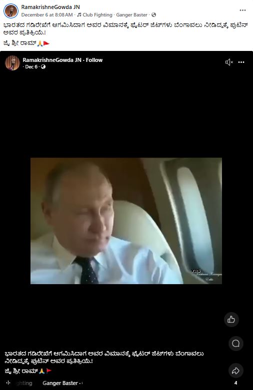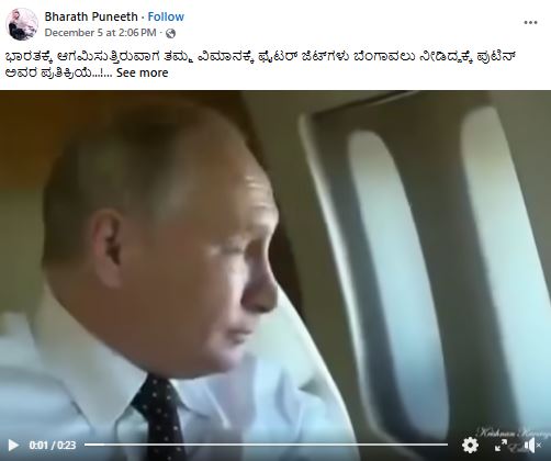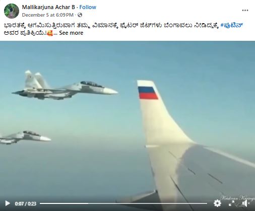 ರಷ್ಯಾ ಅಧ್ಯಕ್ಷ ವ್ಲಾದಿಮಿರ್ ಪುಟಿನ್ ಅವರು ಭಾರತಕ್ಕೆ ಆಗಮಿಸುತ್ತಿದ್ದ ವೇಳೆ ಭಾರತೀಯ ವಾಯು ಸರಹದ್ದು ಪ್ರವೇಶಿಸಿದ ಬಳಿಕ ವಾಯುಪಡೆ ಯುದ್ಧ ವಿಮಾನಗಳು ಬೆಂಗಾವಲಾಗಿದ್ದವು ಎಂದು ವೀಡಿಯೋ ಒಂದು ಸಾಮಾಜಿಕ ಮಾಧ್ಯಮಗಳಲ್ಲಿ ವೈರಲ್ ಆಗಿದೆ.