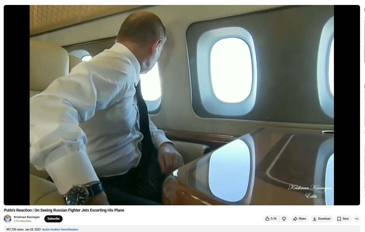 ವೈರಲ್ ಆಗಿರುವ 32 ಸೆಕೆಂಡುಗಳ ವೀಡಿಯೋದಲ್ಲಿ ಪುಟಿನ್ ತಮ್ಮ ವಿಮಾನದಲ್ಲಿ ಕುಳಿತು ತಮ್ಮ ಪಕ್ಕದಲ್ಲಿ ಹಾದುಹೋಗುವ ಯುದ್ಧ ವಿಮಾನಗಳನ್ನು ನೋಡುತ್ತಿದ್ದಾರೆ. ಅವರ ವಿಮಾನದ ಎರಡೂ ಬದಿಗಳಲ್ಲಿ ಯುದ್ಧ ವಿಮಾನಗಳು ಹಾರಾಡುತ್ತಿರುವುದನ್ನು ವೀಡಿಯೋದಲ್ಲಿ ತೋರಿಸಲಾಗಿದೆ. ಈ ವೈರಲ್ ವೀಡಿಯೋ ಇರುವ ಹೇಳಿಕೆಗಳನ್ನು ಇಲ್ಲಿ ಇಲ್ಲಿ ಇಲ್ಲಿ ನೋಡಬಹುದು.