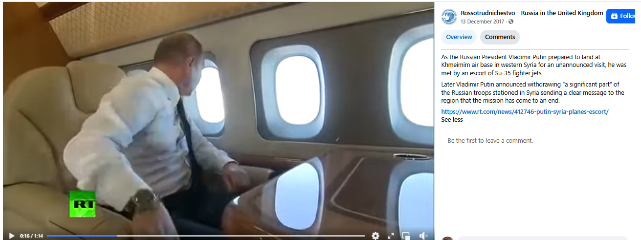 ಆದಾಗ್ಯೂ ಸತ್ಯಶೋಧನೆಯಲ್ಲಿ ಕಂಡುಬಂದಂತೆ, ಈ ವೀಡಿಯೊದಲ್ಲಿನ ತುಣುಕುಗಳು 2017 ರಲ್ಲಿ ಪುಟಿನ್ ಸಿರಿಯಾಕ್ಕೆ ಭೇಟಿ ನೀಡಿದ ಸಮಯದ್ದು ಎಂದು ತಿಳಿದುಬಂದಿದೆ.
