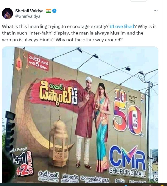 ತೆಲಂಗಾಣದಲ್ಲಿ ಹಾಕಲಾಗಿದ್ದ 2019ರ ಸಿಎಂಆರ್ ಶಾಪಿಂಗ್ ಮಾಲ್ ನ ಹೋರ್ಡಿಂಗ್ ಫೋಟೋವನ್ನು ಕರ್ನಾಟಕದಲ್ಲಿ ‘ಲವ್ ಜಿಹಾದ್’ ಉತ್ತೇಜಿಸುವ ಹೋರ್ಡಿಂಗ್ ಎಂಬಂತೆ ತಪ್ಪಾಗಿ ಹಂಚಿಕೊಳ್ಳಲಾಗುತ್ತಿದೆ
