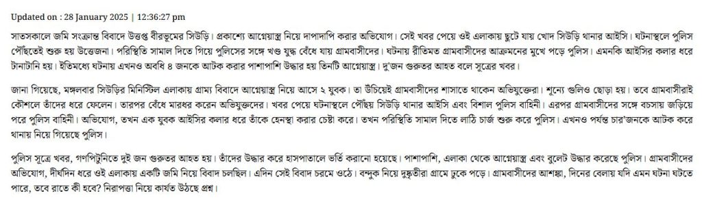 ಜನವರಿ 28, 2025ರ ಕೋಲ್ಕತ್ತಾಟೆಲಿವಿಷನ್ ನೆಟ್ ವರ್ಕ್ ವೆಬ್ಸೈಟ್ ವರದಿಯ ಪ್ರಕಾರ, ಬಿರ್ಭುಮ್ನ ಸಿಯುರಿ ಭೂ ವಿವಾದದಲ್ಲಿ ಸಾರ್ವಜನಿಕವಾಗಿ ಬಂದೂಕನ್ನು ತೋರಿಸಿದ ಆರೋಪ ಕೇಳಿಬಂದಿದೆ. ಪರಿಸ್ಥಿತಿ ಉದ್ವಿಗ್ನತೆ ಹಿನ್ನೆಲೆಯಲ್ಲಿಸಿಯುರಿ ಪೊಲೀಸ್ ಠಾಣೆಯ ಐಸಿ ಸ್ಥಳಕ್ಕೆ ಧಾವಿಸಿದರು. ಪೊಲೀಸರು ಸ್ಥಳಕ್ಕೆ ಆಗಮಿಸುತ್ತಿದ್ದಂತೆ ಉದ್ವಿಗ್ನತೆ ಆಗಿದ್ದು, ನಿಯಂತ್ರಣಕ್ಕೆ ಯತ್ನಿಸಿದಾಗ, ಗ್ರಾಮಸ್ಥರು ಪೊಲೀಸರೊಂದಿಗೆ ಮಾತಿನ ಚಕಮಕಿ ನಡೆಸಿದರು. ಈ ಘಟನೆಯಲ್ಲಿ ಐಸಿ ಕಾಲರ್ ಸಹ ಎಳೆಯಲಾಗಿದೆ. ಘಟನೆಯಲ್ಲಿ ಇದುವರೆಗೆ ನಾಲ್ವರನ್ನು ಬಂಧಿಸಲಾಗಿದ್ದು, ಮೂರು ಬಂದೂಕುಗಳನ್ನು ವಶಪಡಿಸಿಕೊಳ್ಳಲಾಗಿದೆ. ಇಬ್ಬರು ಗಂಭೀರವಾಗಿ ಗಾಯಗೊಂಡಿದ್ದಾರೆ ಎಂದು ಮೂಲಗಳು ತಿಳಿಸಿವೆ ಎಂದಿದೆ.