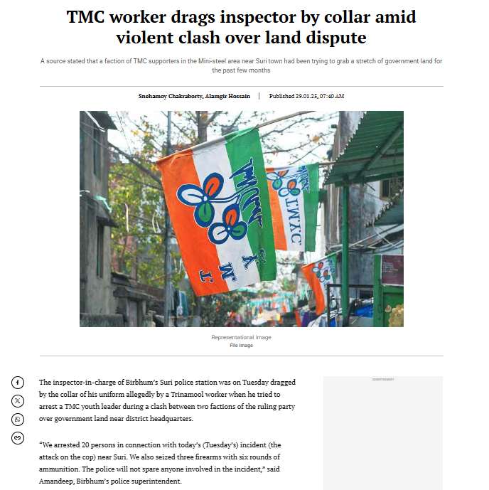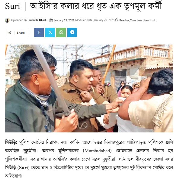 ಫೆಬ್ರವರಿ 3, 2025ರಂದು ಟೆಲಿಗ್ರಾಫ್ ಆನ್ ಲೈನ್ ಪ್ರಕಟಿಸಿದ ವರದಿಯಲ್ಲಿ, “ಬಿರ್ಭೂಮ್ನ ಸೂರಿ ಪೊಲೀಸ್ ಠಾಣೆಯ ಉಸ್ತುವಾರಿ ಇನ್ಸ್ಪೆಕ್ಟರ್ ಅವರನ್ನು ಮಂಗಳವಾರ ಜಿಲ್ಲಾ ಕೇಂದ್ರದ ಬಳಿ ಸರ್ಕಾರಿ ಭೂಮಿಗಾಗಿ ಆಡಳಿತ ಪಕ್ಷದ ಎರಡು ಬಣಗಳ ನಡುವೆ ನಡೆದ ಘರ್ಷಣೆಯ ಸಂದರ್ಭದಲ್ಲಿ ಎಳೆಯಲಾಗಿದೆ. ಟಿಎಂಸಿ ಯುವ ನಾಯಕನನ್ನು ಬಂಧಿಸಲು ಪ್ರಯತ್ನಿಸಿದಾಗ ತೃಣಮೂಲ ಕಾರ್ಯಕರ್ತನೊಬ್ಬ ಅವರ ಸಮವಸ್ತ್ರದ ಕಾಲರ್ ಎಳೆದಿದ್ದಾನೆ ಎಂದು ಆರೋಪಿಸಲಾಗಿದೆ.