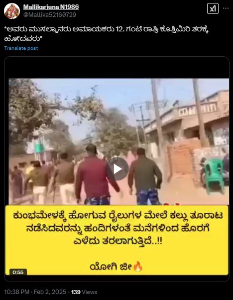 ಸಾಮಾಜಿಕ ಮಾಧ್ಯಮದ ಪೋಸ್ಟ್ ನಲ್ಲಿ “ಕುಂಭಮೇಳಕ್ಕೆ ಹೋಗುವ ರೈಲುಗಳ ಮೇಲೆ ಕಲ್ಲು ತೂರಾಟ ನಡೆಸಿದವರನ್ನು ಹಂದಿಗಳಂತೆ ಮನೆಗಳಿಂದ ಹೊರಗೆ ಎಳೆದು ತರಲಾಗುತ್ತಿದೆ ಯೋಗಿಜಿ ಎಂಬಂತೆ ಹೇಳಿಕೆಯೊಂದಿಗೆ ವೀಡಿಯೋ ಒಂದನ್ನು ಹಂಚಿಕೊಳ್ಳಲಾಗಿದೆ.