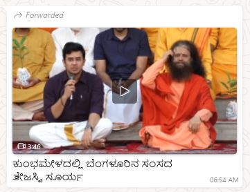 ಮಹಾ ಕುಂಭಮೇಳದಲ್ಲಿ ಸಂಸದ ತೇಜಸ್ವಿ ಸೂರ್ಯ ಮಾತನಾಡಿದ್ದಾರೆ ಎಂಬಂತೆ ಸಾಮಾಜಿಕ ಮಾಧ್ಯಮದಲ್ಲಿ ವೀಡಿಯೋ ಒಂದನ್ನು ಹಂಚಿಕೊಳ್ಳಲಾಗುತ್ತಿದೆ. ವಾಟ್ಸಾಪ್ ನಲ್ಲಿ ಕಂಡುಬಂದ ಈ ಹೇಳಿಕೆಯಲ್ಲಿ, ತೇಜಸ್ವಿ ಮಾತನಾಡಿದ್ದಾರೆ ಎನ್ನಲಾಗಿದೆ.