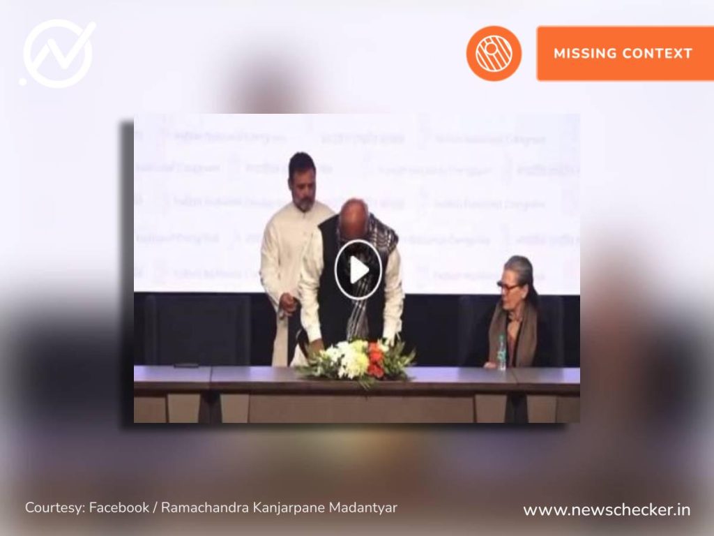 ಮಲ್ಲಿಕಾರ್ಜುನ ಖರ್ಗೆಯವರನ್ನು ರಾಹುಲ್ ಗಾಂಧಿ ಕುರ್ಚಿಯಿಂದ ಎಬ್ಬಿಸಿ ಅವಮಾನ ಮಾಡಿದ್ದಾರೆ ಎಂಬಂತೆ ವೀಡಿಯೋ ಒಂದನ್ನು ಹಂಚಿಕೊಳ್ಳಲಾಗುತ್ತಿದೆ. ಕ್ಲಿಪ್ಡ್ ವೀಡಿಯೋ ಬಳಸಿ ಮಲ್ಲಿಕಾರ್ಜುನ ಖರ್ಗೆಯವರನ್ನು ರಾಹುಲ್ ಗಾಂಧಿ ಕುರ್ಚಿಯಿಂದ ಎಬ್ಬಿಸಿ ಅವಮಾನ ಮಾಡಿದ್ದಾರೆ ಎಂದು ಹೇಳಲಾಗಿದೆ. ಖರ್ಗೆಯವರ ಬಗ್ಗೆ ರಾಹುಲ್ ಅಗೌರವಪೂರ್ವಕ ನಡೆದಿದ್ದು ಕಂಡುಬಂದಿಲ್ಲ. ಈ ಹೇಳಿಕೆ ತಪ್ಪಾದ ಸಂದರ್ಭವಾಗಿದೆ. ಈ ಕುರಿತ ವರದಿ ಇಲ್ಲಿದೆ