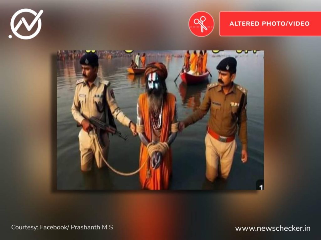 ಸನ್ಯಾಸಿ ವೇಷ ಧರಿಸಿದ ವ್ಯಕ್ತಿಯನ್ನು ಪೊಲೀಸರು ಬಂಧಿಸಿರುವ ಫೋಟೋ ಒಂದು ಸಾಮಾಜಿಕ ಮಾಧ್ಯಮಗಳಲ್ಲಿ ಹರಿದಾಡಿದೆ. ಬಳಕೆದಾರರು ಇದು ಪ್ರಯಾಗ್ ರಾಜ್ ನಲ್ಲಿ ನಡೆಯುತ್ತಿರುವ ಮಹಾಕುಂಭ ಮೇಳದ್ದು ಎಂದು ಹೇಳಿದ್ದಾರೆ. ಸತ್ಯಶೋಧನೆ ನಡೆಸಿದಾಗ, ಮಹಾ ಕುಂಭಮೇಳದಿಂದ ಸನ್ಯಾಸಿಯ ವೇಷ ಧರಿಸಿದ ವ್ಯಕ್ತಿಯನ್ನು ಬಂಧಿಸಲಾಗಿದೆ ಎಂದು ತೋರಿಸುವ ವೈರಲ್ ಫೋಟೋ ಎಐ ರಚಿಸಲಾಗಿದೆ, ಅಯೂಬ್ ಖಾನ್ ಎನ್ನುವ ವ್ಯಕ್ತಿಯನ್ನು ಕುಂಭಮೇಳದಲ್ಲಿ ಯತಿ ನರಸಿಂಹಾನಂದ ಗಿರಿ ಅವರ ಶಿಬಿರದ ಹೊರಗಿನಿಂದ ಬಂಧಿಸಲಾಗಿದ್ದರೂ ಆತ ಭಯೋತ್ಪಾದಕನಲ್ಲ ಎಂದು ಉತ್ತರ ಪ್ರದೇಶ ಪೊಲೀಸರು ಹೇಳಿದ್ದಾರೆ. ಈ ಕುರಿತ ವರದಿ ಇಲ್ಲಿದೆ