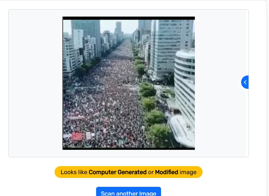 ഫേക്ക് ഇമേജ് ഡിറ്റക്ടർ ടൂൾ കമ്പ്യൂട്ടർ ജനറേറ്റഡ് അല്ലെങ്കിൽ മോഡിഫൈഡ് ഇമേജ് പോലെ തോന്നുന്നുവെന്ന ഫലം നൽകി.