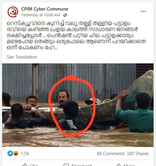 CPIM Cyber Commune എന്ന ഐഡിയിൽ നിന്നുള്ള പോസ്റ്റിന് 380 ഷെയറുകളും 1.5 k വ്യവുകളുമാണ് ഞങ്ങൾ നോക്കുമ്പോൾ കണ്ടത്.
