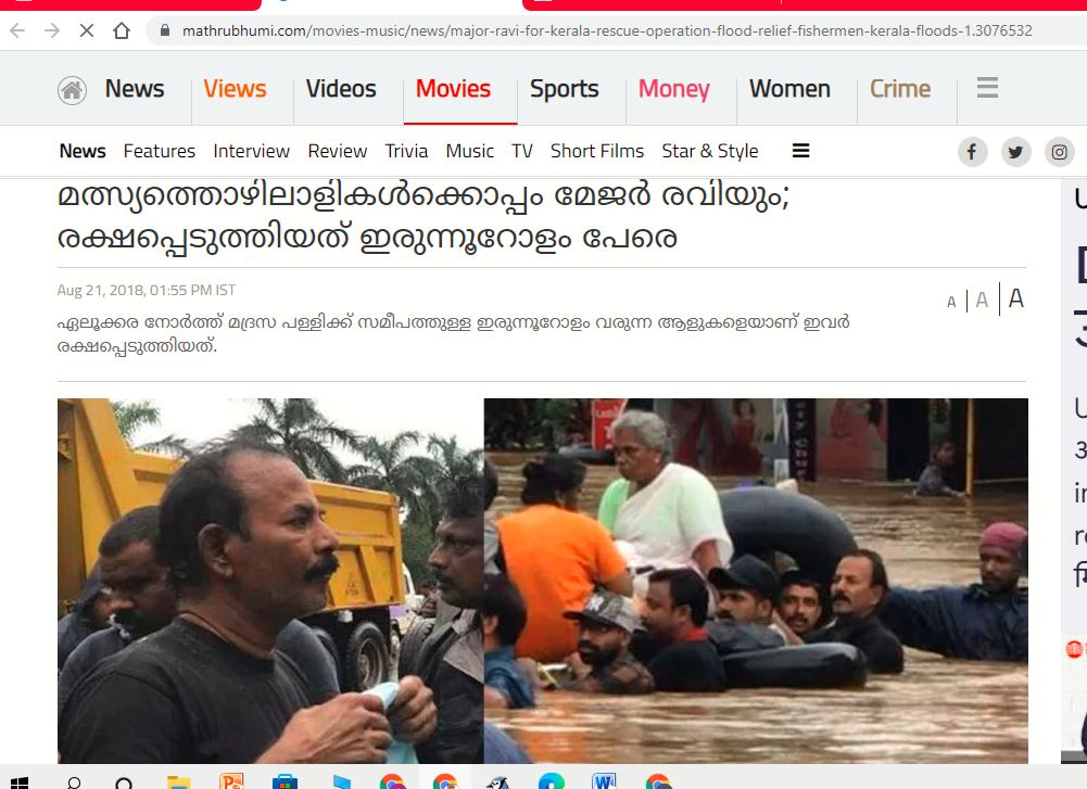 ഞങ്ങൾ ഈ പടം റിവേഴ്സ് ഇമേജ് സേർച്ച് ചെയ്തപ്പോൾ, 2018 ഓഗസ്റ്റ് 21നുള്ള മാതൃഭൂമി വാര്ത്ത കിട്ടി. മേജര് രവിയുടെ നേതൃത്വത്തിൽ 200 ഓളം പേരെ മഹാപ്രളയത്തില് നിന്നും രക്ഷിച്ചുവെന്നാണ് വാർത്ത. പെരിയാറിനടുത്തുള്ള ആലുവ ഏലൂക്കര ഭാഗത്ത് പുഴ കരകവിഞ്ഞൊഴുകിയപ്പോഴാണ് മേജര് രവി മത്സ്യതൊഴിലാളികള്ക്കൊപ്പം ചേര്ന്ന് രക്ഷാപ്രവര്ത്തനം നടത്തിയതെന്ന് വാര്ത്ത പറയുന്നു.