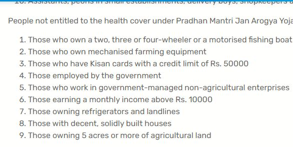 ഗ്രാമീണ മേഖലയിൽ ഈ പദ്ധതിയ്ക്ക് അർഹരായവർ, നഗര മേഖലയിൽ അർഹരായവർ, അർഹതയില്ലാത്തവർ എന്നിവരുടെയൊക്കെ പട്ടിക ഈ വെബ്സൈറ്റുകളിൽ നിന്നും കിട്ടും. ഈ പദ്ധതി പ്രകാരം എല്ലാവർക്കും ആയുഷ്മാന് ഭാരതിന്റെ ഇൻഷുറൻസ് പരിരക്ഷ കിട്ടില്ല.