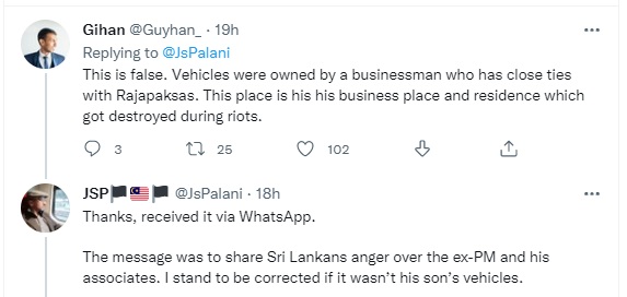 ശ്രീലങ്കൻ സാമ്പത്തിക പ്രതിസന്ധിയുടെ ഇടയിൽ അഗ്നിക്കിരയാകുന്ന വൈറൽ വീഡിയോയിലുള്ള ആഡംബര കാറുകൾ മഹിന്ദ രാജപക്സെയുടെ മകന്റേതല്ല, സച്ചിത് ഡി സിൽവയുടെ ഉടമസ്ഥതയിലുള്ള അവെൻറ ഗാർഡൻ ഹോട്ടൽസിന്റെ പരിസരത്ത് നിന്നാണ് ആഡംബര കാറുകൾ അഗ്നിക്കിരയാകുന്ന വീഡിയോ ചിത്രീകരിച്ചത്.