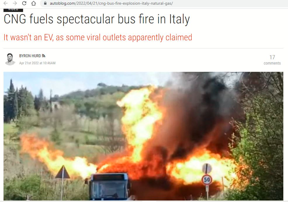 ഇറ്റലിയിലെ പെറുഗ്വിയയിൽ കത്തിയ ബസ് സിഎൻജി ബസാണ് എന്ന് ഏപ്രിൽ21 ന് ഓട്ടോ ബ്ലോഗ് എന്ന വെബ്സൈറ്റ് വാർത്ത നൽകിയിട്ടുണ്ട്.