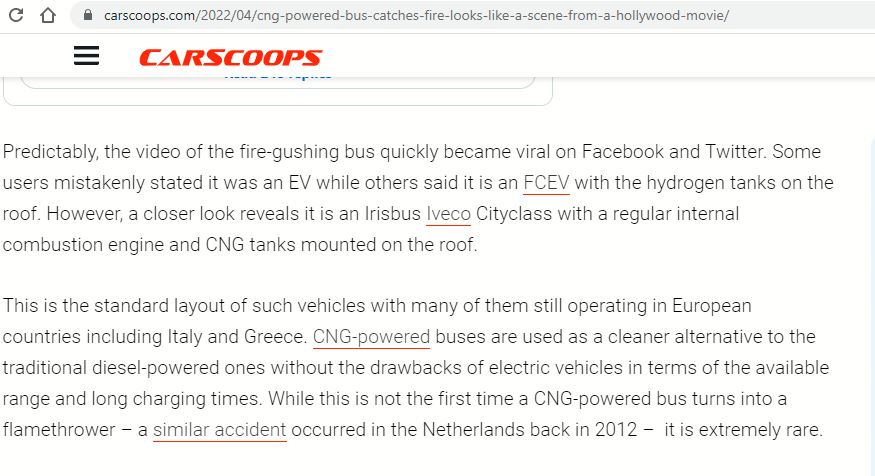 കാർസ് സ്കൂപ് എന്ന വെബ്സൈറ്റും ഏപ്രിൽ 20 ന് നൽകിയ വാർത്തയിലും കത്തിയത് സിഎൻജി ബസാണ് എന്ന് പറയുന്നു.