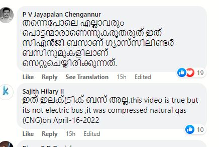 ഞങ്ങൾ പരിശോധിച്ചപ്പോൾ, Chalakudy News TV ന്റെ പോസ്റ്റിൽ P V Jayapalan Chengannur,Binoy P D Danial എന്നീ ഐഡികളിൽ നിന്നും രണ്ടു പേരിട്ടിരിക്കുന്ന കമന്റുകൾ കണ്ടു. അവർ ‘കത്തിയത്,ഇലക്ട്രിക് ബസ് അല്ലെന്നും സിഎൻജി ബസാണ് എന്ന് വ്യക്തമാക്കിയിട്ടുണ്ട്.