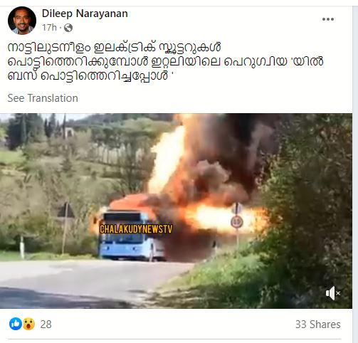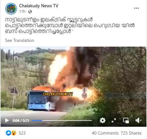“ഇറ്റലിയിലെ പെറുഗ്വിയയിൽ ഇലക്ട്രിക് ബസ് പൊട്ടിത്തെറിച്ചുവെന്ന്” ധ്വനിപ്പിക്കുന്ന, ഒരു പോസ്റ്റ് ഫേസ്ബുക്കിൽ വൈറലാവുന്നുണ്ട്. “നാട്ടിലുടനീളം ഇലക്ട്രിക് സ്കൂട്ടറുകൾ പൊട്ടിത്തെറിക്കുമ്പോൾ ഇറ്റലിയിലെ പെറുഗ്വിയയിൽ ബസ് പൊട്ടിത്തെറിച്ചപ്പോൾ,” എന്നാണ് പോസ്റ്റ് പറയുന്നത്. Chalakudy News TV എന്ന ഐഡിയിൽ നിന്നുള്ള പോസ്റ്റിന് ഞങ്ങൾ കാണുമ്പോൾ 725 ഷെയറുകൾ ഉണ്ട്.