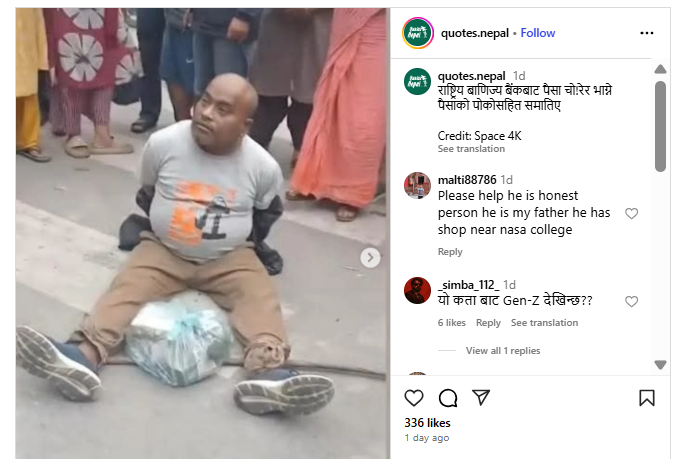 നേപ്പാളിൽ നിന്നുള്ള ഒരു ഇൻസ്റ്റാഗ്രാം അക്കൗണ്ടിൽ (2025 സെപ്റ്റംബർ 10) വൈറൽ വീഡിയോയുമായി ബന്ധപ്പെട്ട ചിത്രങ്ങൾ പങ്കുവച്ചിട്ടുണ്ട്. ആ പോസ്റ്റിൽ മാൽതി എന്ന ഉപയോക്താവ് കമന്റ് ചെയ്തു: “ദയവായി സഹായിക്കൂ. അദ്ദേഹം സത്യസന്ധനായ വ്യക്തിയാണ്. എന്റെ അച്ഛനാണ്. അദ്ദേഹത്തിന് നാസ കോളേജിന് സമീപം കടയുണ്ട്.”