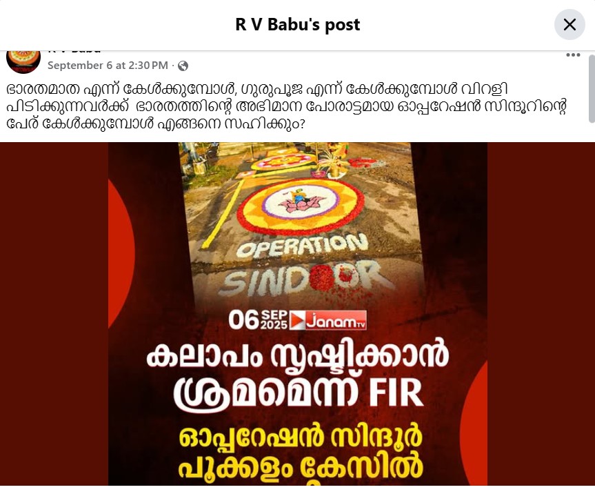 “കലാപം സൃഷ്ടിക്കാൻ ശ്രമമെന്ന് എഫ്ഐആർ. ഓപ്പറേഷൻ സിന്ദൂർ പൂക്കളം കേസിൽ സൈനികരും പ്രതിപ്പട്ടികയിൽ,” എന്ന് എഴുതിയ ജനം ടിവി ന്യൂസ്കാർഡിനൊപ്പമാണ് പ്രചരണം.