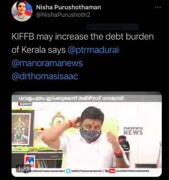 KIIFB കേരളത്തിന്റെ കടബാധ്യത വര്ധിപ്പിക്കുമെന്ന് തമിഴ്നാട് ധനമന്ത്രി ഡോ.പി ത്യാഗരാജന്’ എന്ന് മനോരമ ന്യൂസ് അവതാരക നിഷ പുരുഷോത്തമന് ട്വീറ്റ്ചെയ്തിരുന്നു.ത്യാഗരാജനെ മെന്ഷന് ചെയ്തുകൊണ്ടായിരുന്നു ട്വീറ്റ്. നിഷ ഈ ട്വീറ്റ് ചെയ്യുന്നതിന് മുൻപ് തന്നെ തമിഴ്നാട് ധനകാര്യ മന്ത്രി ഡോ.പി ത്യാഗരാജനെ ഉദ്ധരിച്ചു ചിലരൊക്കെ ഫേസ്ബുക്കിൽ ഇതേ തരത്തിലുള്ള പോസ്റ്റുകൾ ചെയ്തിരുന്നു.
