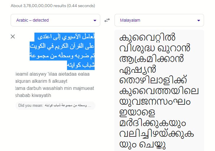 പോസ്റ്റിലെ അറബി വിവരണം ഗൂഗിൾ ട്രാൻസിലേറ്റർ ഉപയോഗിച്ച് വിവർത്തനം ചെയ്തപ്പോൾ, പോസ്റ്റിൽ പറയുന്നത് പോലെ കുവൈറ്റിൽ ഖുർആനെ അപമാനിച്ചുവെന്നതാണ് ആക്രമിക്കപ്പെടുന്ന വ്യക്തിയ്ക്കെതിരെയുള്ള ആരോപണം എന്ന് മനസിലായി. എന്നാൽ സംഭവം നടന്നത് 2020ലാണ്.